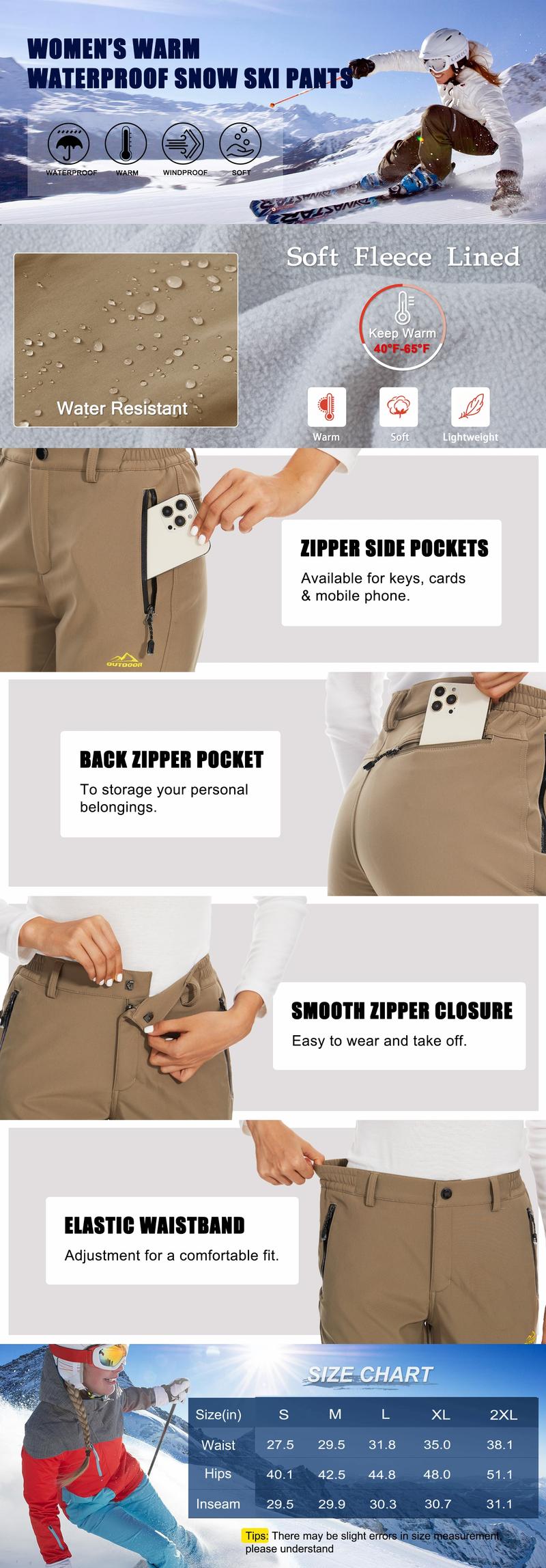 [WATERPROOF SOFTSHELL: Women's insulated softshell pants with waterproof coating surface layer to repel water, rain, snow and avoid cold wind, provides the excellent comfort for winter outdoor wearing., WARM FLEECE: Skin-friendly warm hiking pants features outstanding fleece lined fabric that locks heat to keep you warm, features well moisture-wicking. Keep you warm and dry in winter., Zipper Pockets: Women's snow ski snowboard pants with 2 front zipper pockets are convenient to store your cell phone, keys, cards securely., Feature: Ripstop fabrics provide wear-resistant and scratch resistant performance. Zipper closure mid-waist with an elastic side part to allow the body to fit comfortably., Occasions: Best for hiking, skiing, snowboarding, camping, ice fishing, snowing, hunting, fishing, traveling, climbing, mountaineering, cycling, etc.]